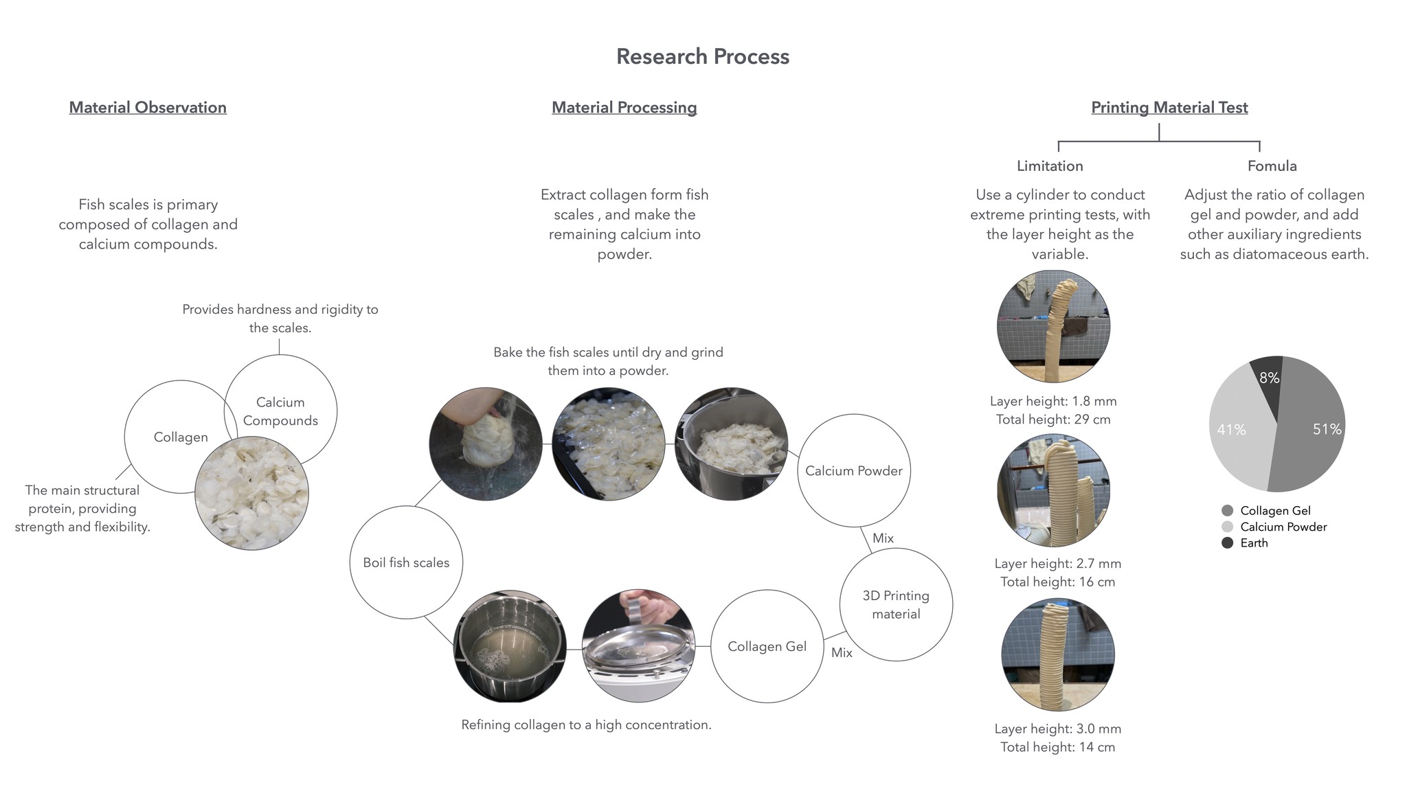 What Remains of the Fish explores the transformation of fish scales into 3D printing material by utilizing the inherent properties of fish scales found in Taiwan. As an island surrounded by the sea, seafood has long been an essential part of Taiwan’s diet and culture. However, it is estimated that approximately 270,000 tons of fish processing residue are generated annually. While some by-products, such as entrails, are reused as fertilizers, a large portion of fish scales is discarded as waste, causing environmental impact. This project reframes fish scales not as residue, but as a valuable material resource, proposing a circular approach that converts marine waste into printable matter through material research and additive manufacturing.