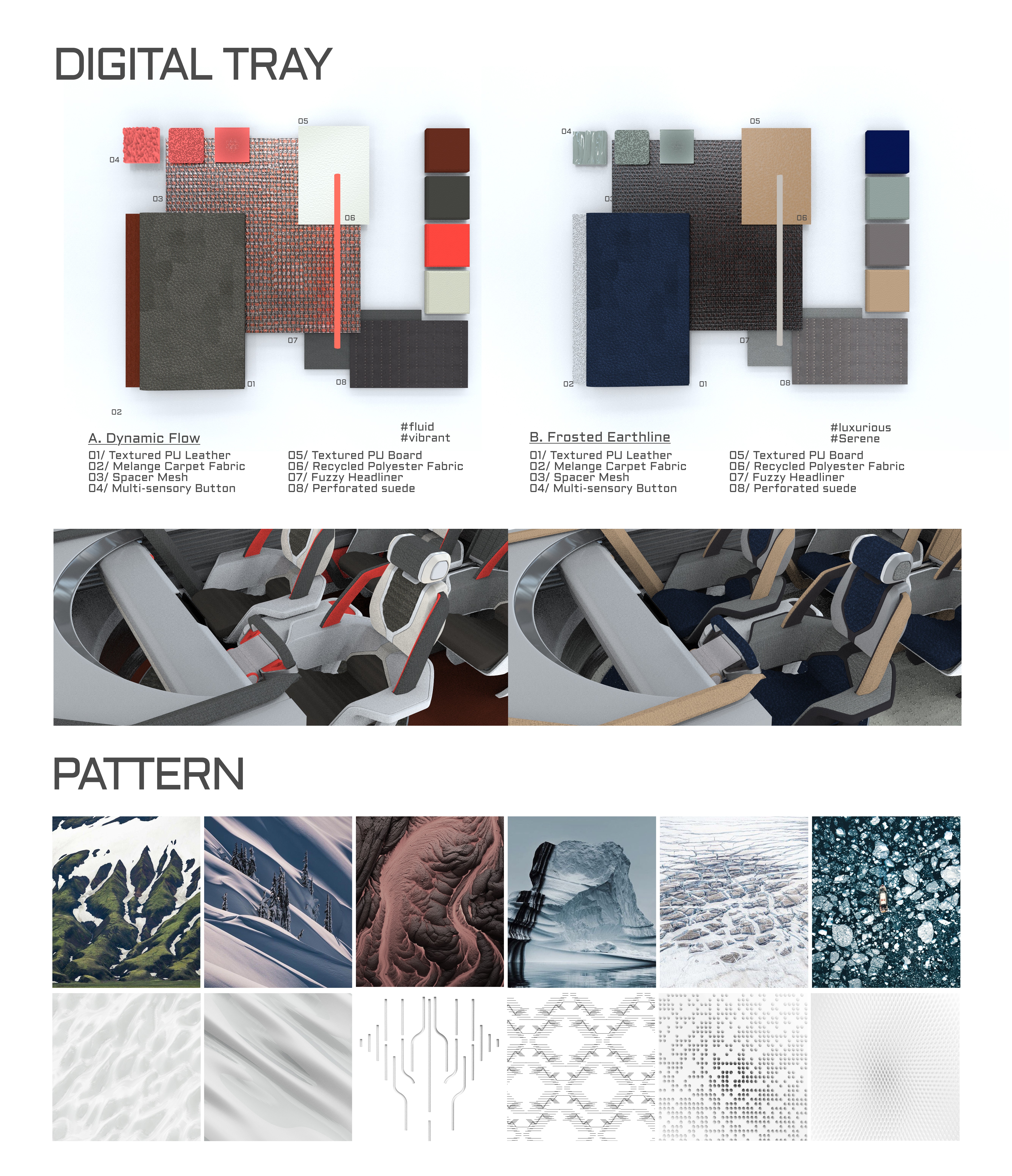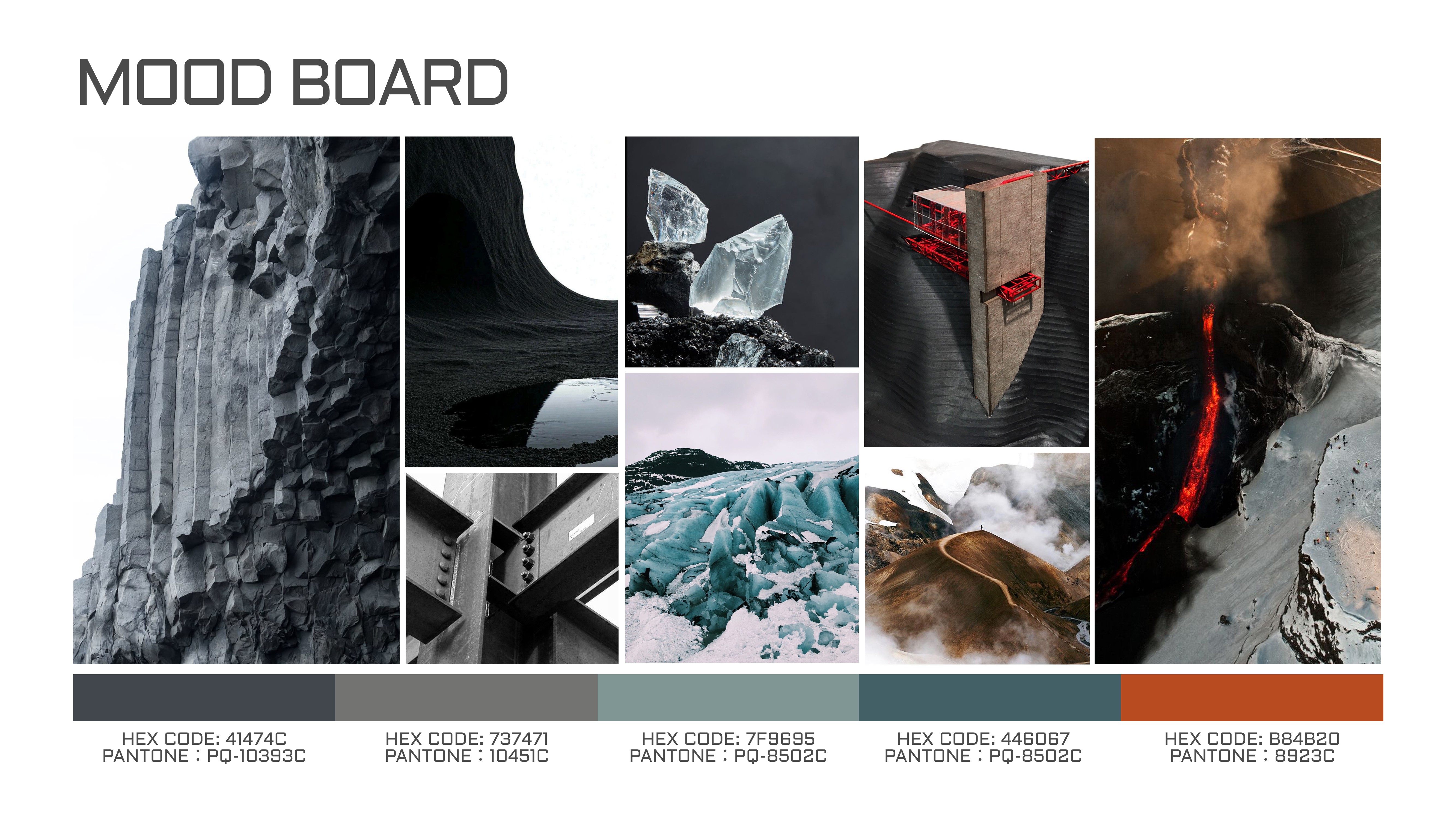 Project is inspired by Iceland’s distinctive natural landscapes. Textures and material expressions derived from volcanic strata, glacial fissures, and wind-eroded terrains are translated into CMF strategies for both the exterior and interior color palettes.