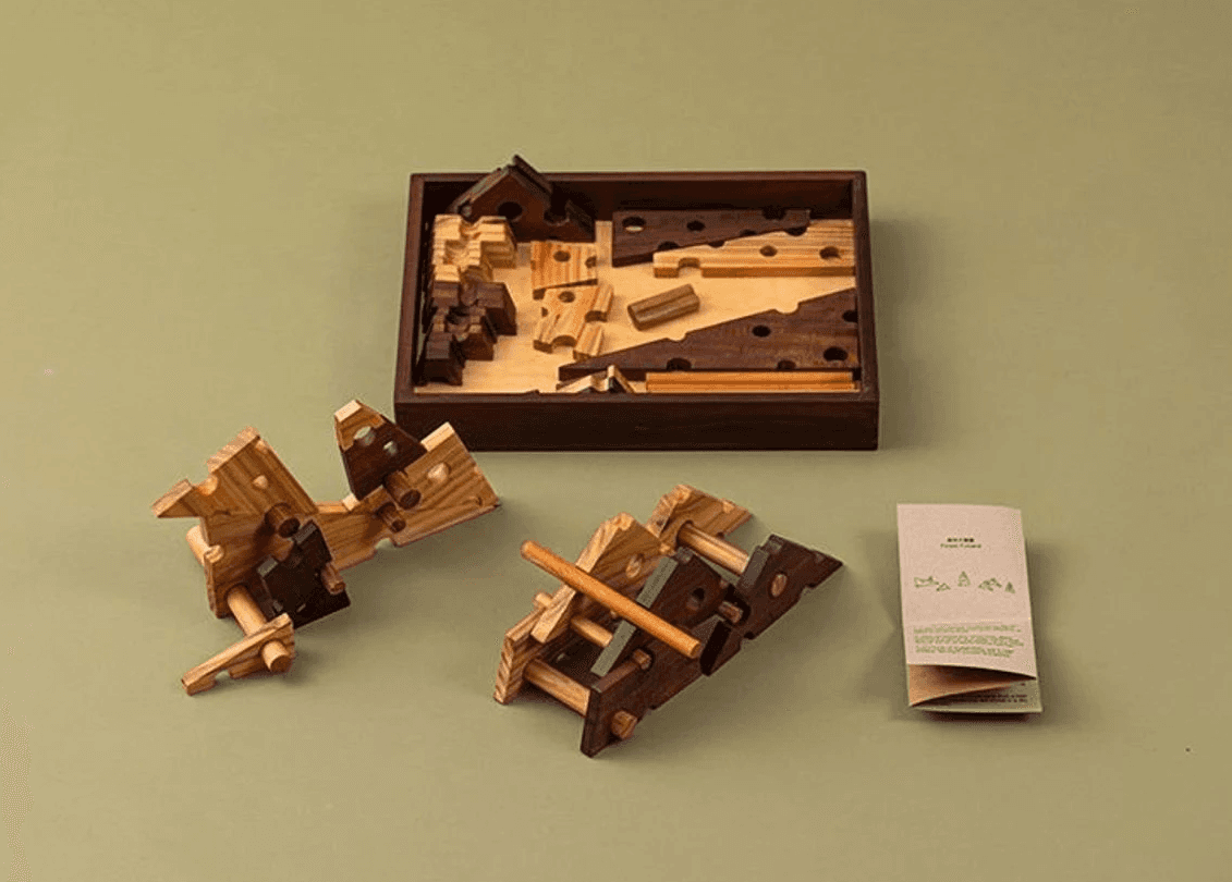 A modular wooden balance game inspired by forest landscapes, combining play with learning about local tree species.