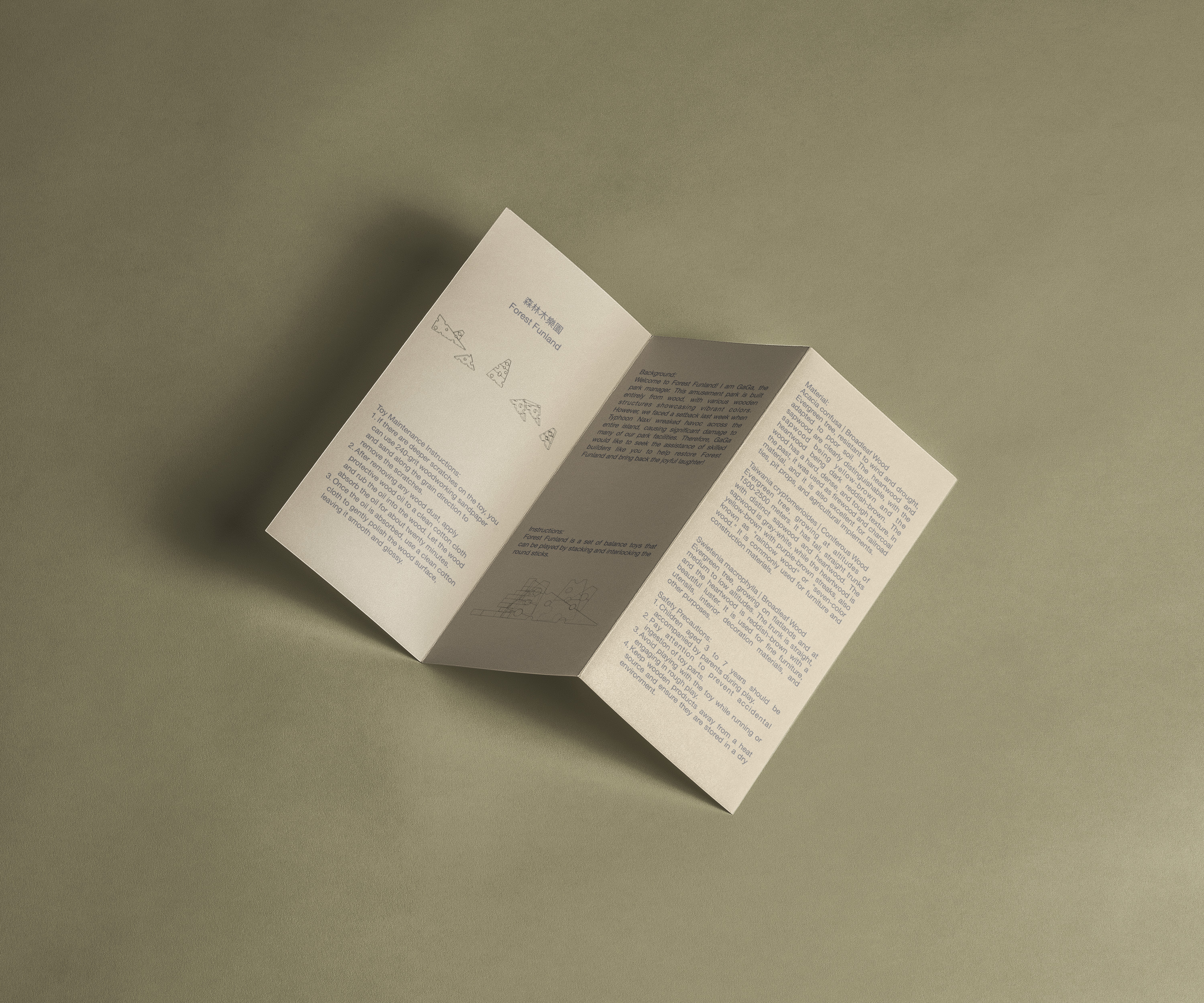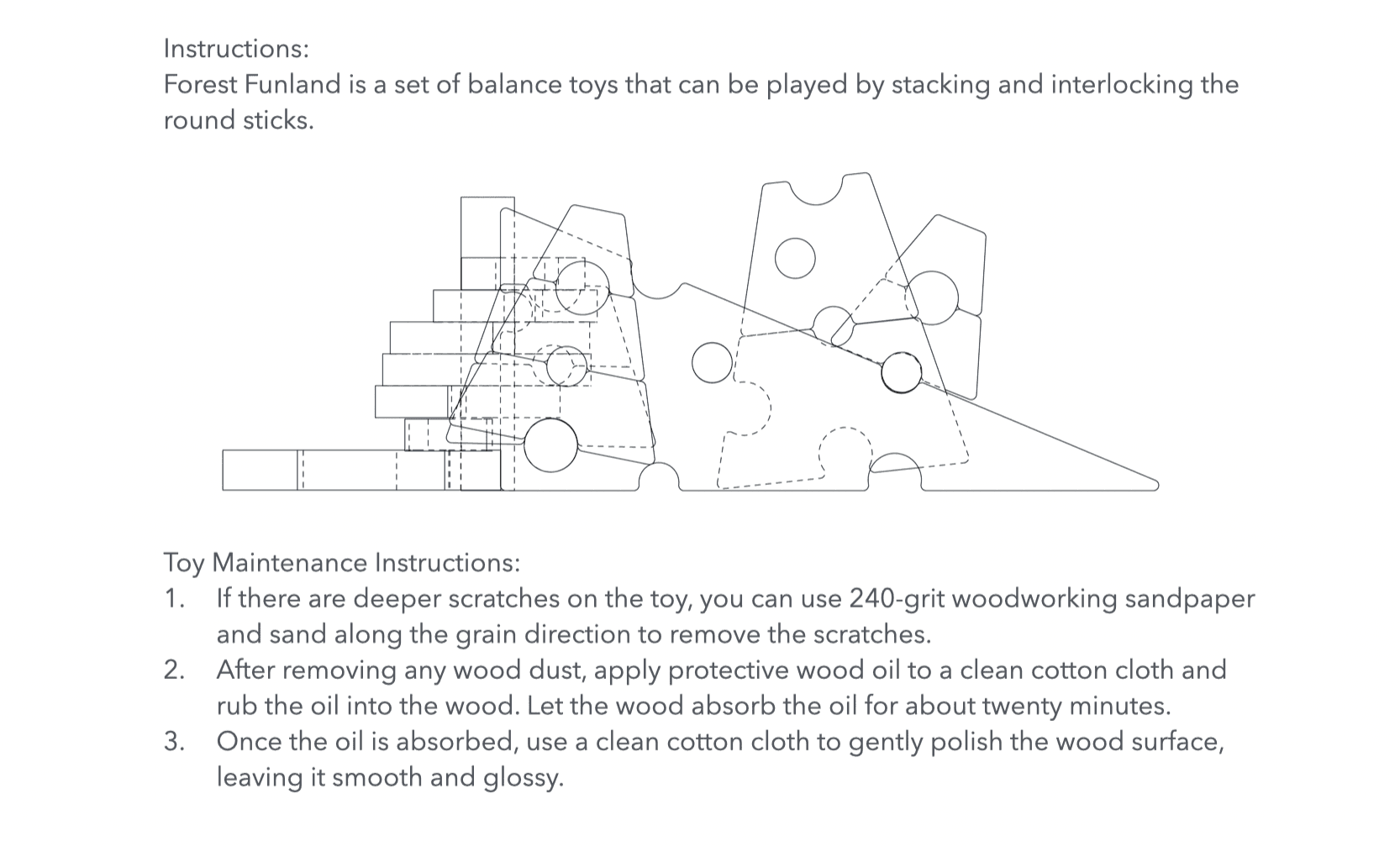 Using a balance game set as a prototype, the Forest Funland incorporates elements ofthe forest (trees and hills). Each component is made with square or circular cutouts, paired with long tree trunks, allowing the game to extend continuously in all directions, challenging various shapes.