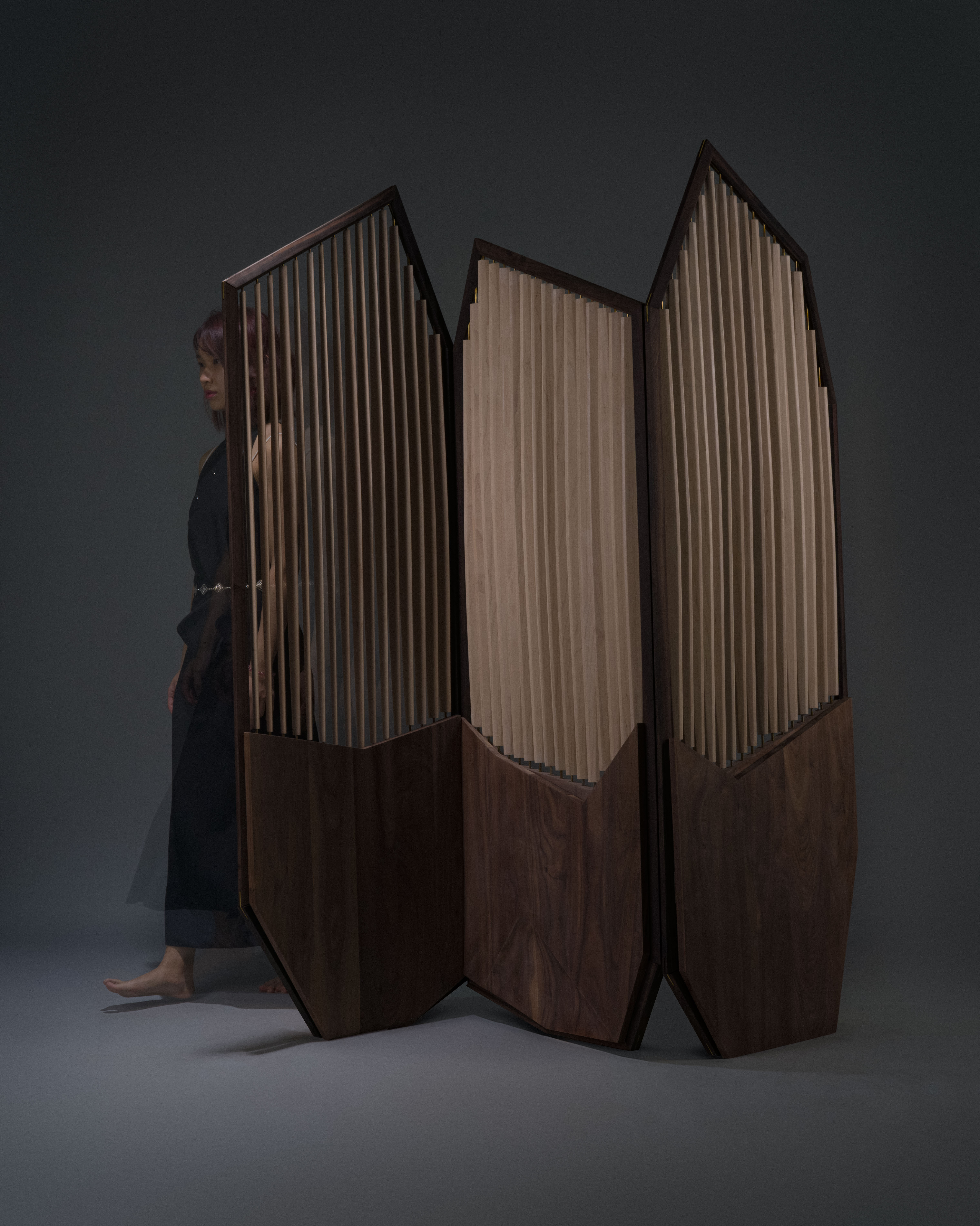 Inspired by Taiwan’s mountain ranges, this wooden screen translates layered peaks and drifting mist into a sculptural partition of light and shadow.